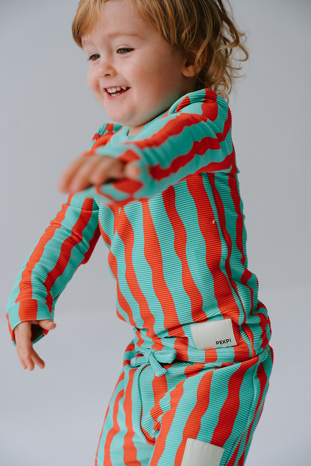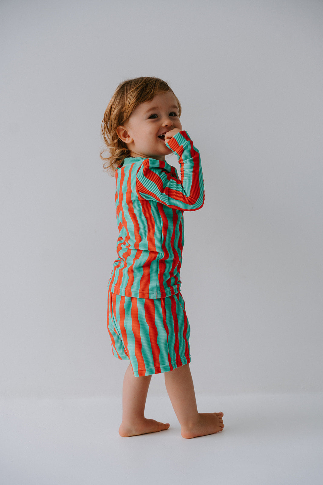 Get your little one ready for summer with these vibrant swim shorts. Featuring a playful Sea Kelp Aqua stripe print on a ribbed fabric, these swim trunks add a splash of fun to pool or beach days. Crafted from high-quality, ribbed recycled material, it combines comfort with eco-friendliness.